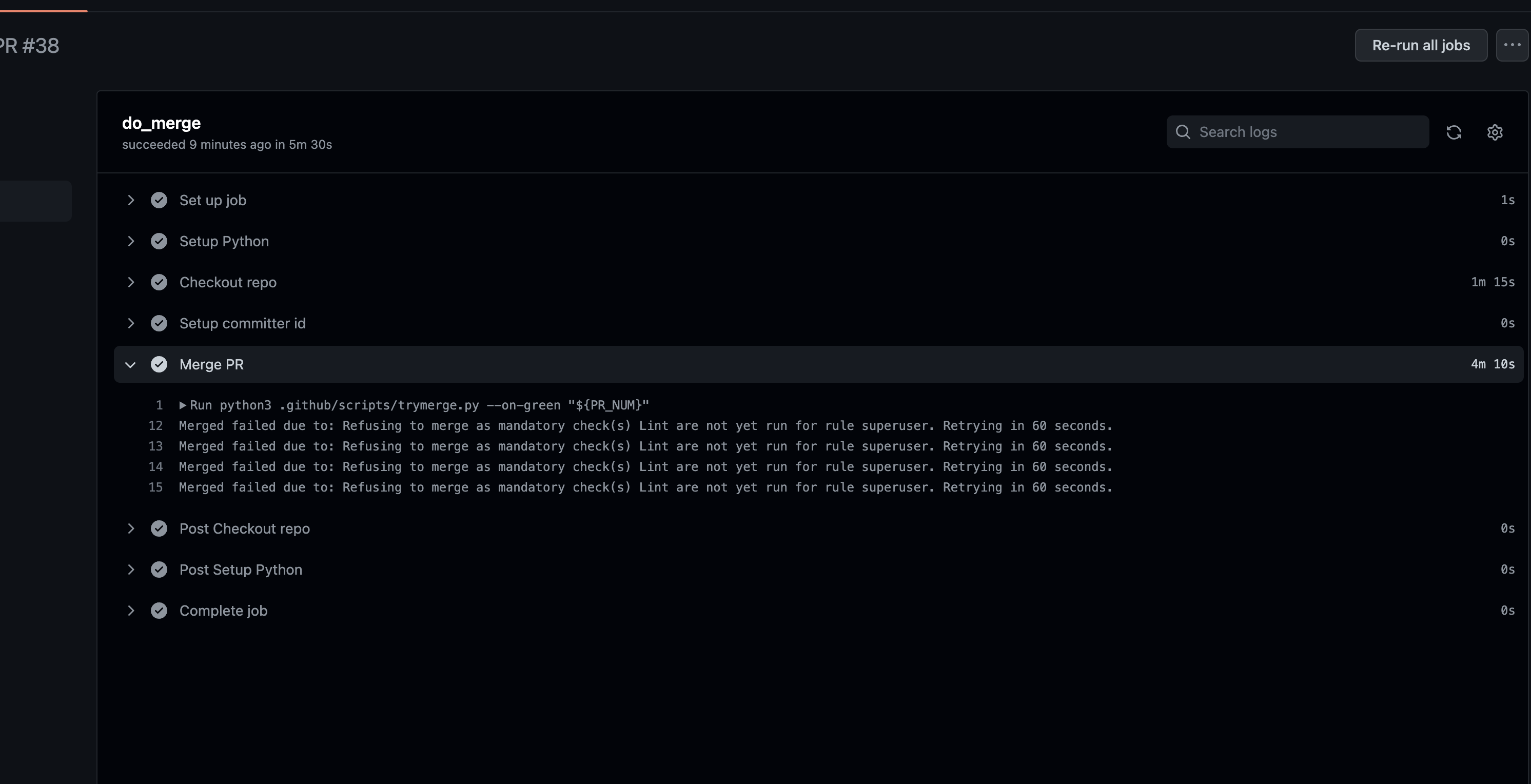 trymerge.MandatoryChecksMissingError: Refusing to merge as land check(s) are not yet run